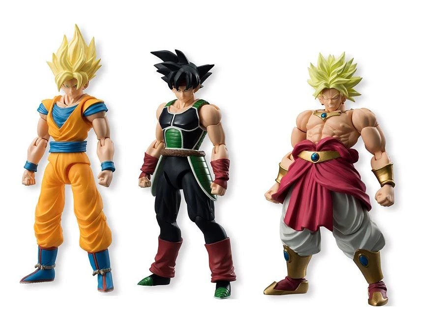 Ban Dai 3er-Minifiguren-Set mit Bardock, Broly und Super Saiyn Goku 2. Jeweils ca. 8cm hoch (3,2-Inch Format), Mit vielen Bewegungspunkten für dynamische Posen, Mit Tauschhänden als Zubehör, Einzeln verpackt in Blister.