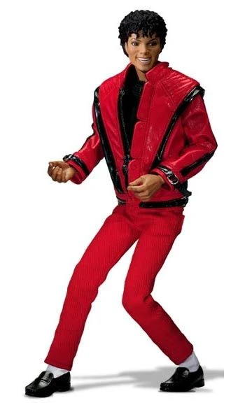 Die Figur trägt Stoffkleidung und stellt zusammen mit der mitgelieferten Kulisse eine detaillierte Nachbildung aus dem Video dar.